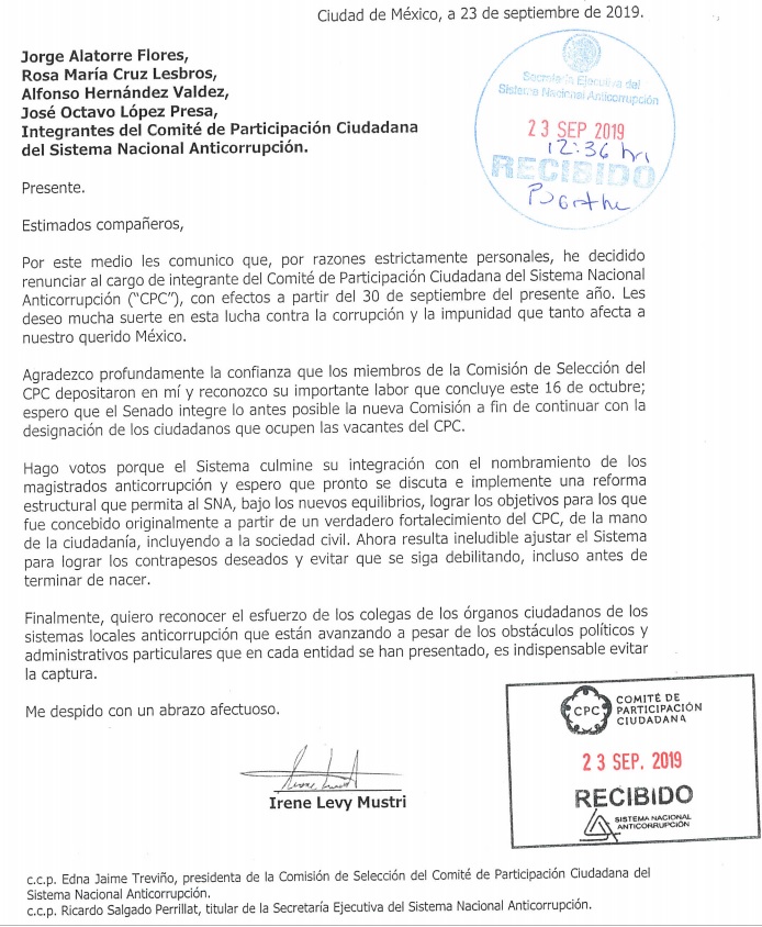 La renuncia tendrá efecto a partir del próximo 30 de septiembre del presente año. Levy deseó “mucha suerte en la lucha contra la corrupción y a la impunidad que tanto afecta a nuestro querido México”.