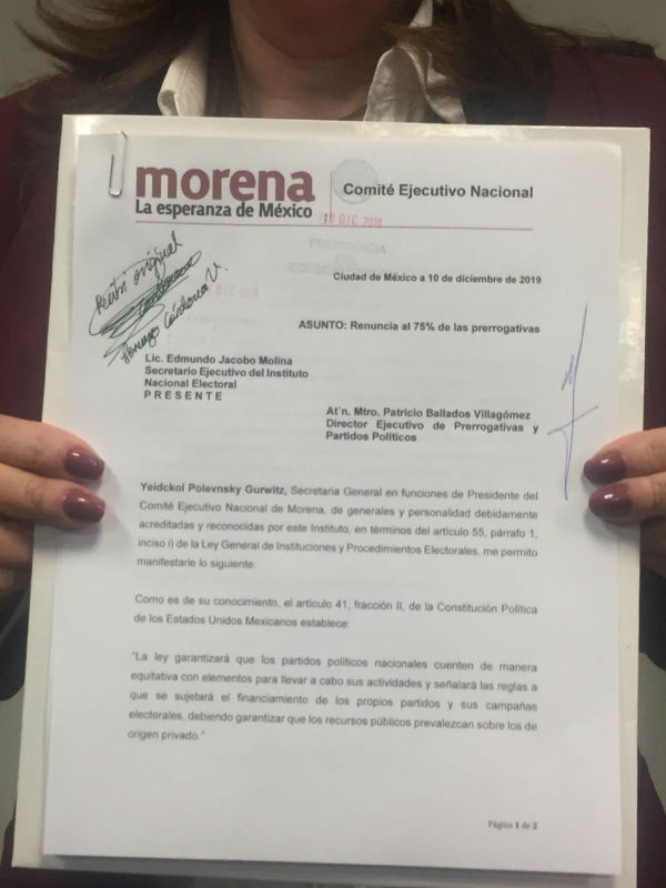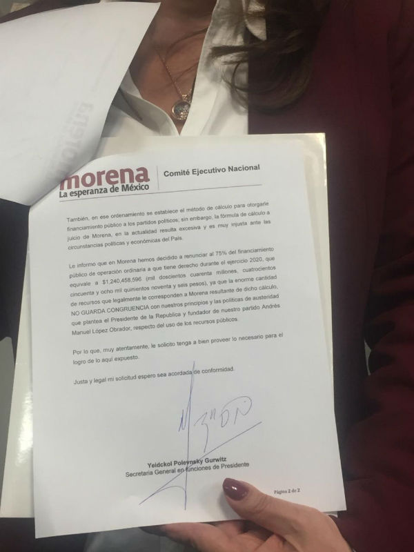 “Le informo que en Morena hemos decidido a renunciar al 75% del financiamiento público de operación ordinaria a que tiene derecho durante el ejercicio 2020 que equivale a 1,240,458,596 pesos (mil doscientos cuarenta millones cuatrocientos cincuenta y ocho mil quinientos noventa y seis pesos), ya que la enorme cantidad de recursos que legalmente le corresponde a Morena resultante de dicho cálculo no guarda congruencia con nuestros principios y las políticas de austeridad que plantea el presidente de la República y fundador de nuestro partido, Andrés Manuel López Obrador respecto del uso de los recursos públicos”.