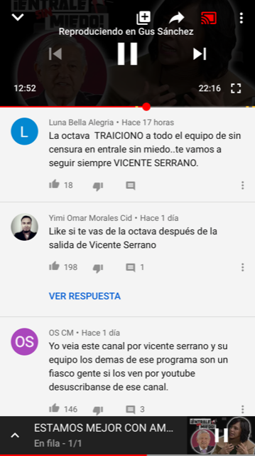 En YouTube, en el último programa de Serrano -que acumula más de 384 mil reproducciones y más de 25 mil “me gusta“- hay varios comentarios de los usuarios, que le dicen a la televisora que se darán de baja del canal debido a la salida del aire del comunicador: