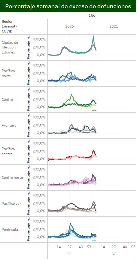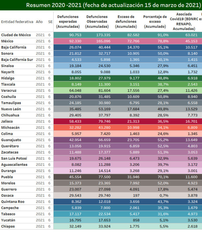 El Estado de México es la segunda entidad más afectada, con un porcentaje de exceso de mortalidad de 78.8 por ciento; le siguen Baja California con 55.1 por ciento y Sonora con 50 por ciento.