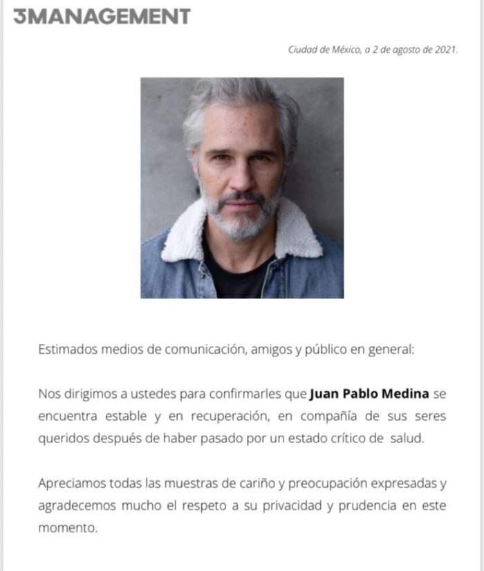 El actor Juan Pablo Medina de La Casa de las Flores fue hospitalizado por trombosis hace unas semanas y se informa que el actor ya se encuentra estable y en recuperación. Con respecto a la supuesta amputación de su pierna la familia pide respeto sin corroborar la información. pic.twitter.com/bVTsoCVPA0