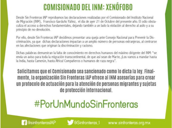 Por su parte, Sin Fronteras emitió un comunicado titulado “Comisionado del INM: xenófobo”, para reprobar los dichos de Yáñez Garduño.