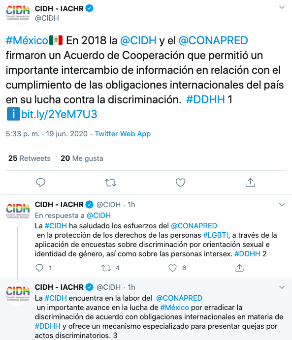 También a través de Twitter, la CIDH saludó los esfuerzos que el Conapred ha realizado en la protección de los derechos de las personas de la comunidad LGBTI, a través de la aplicación de encuestas sobre discriminación por orientación sexual e identidad de género, así como sobre las personas intersex.