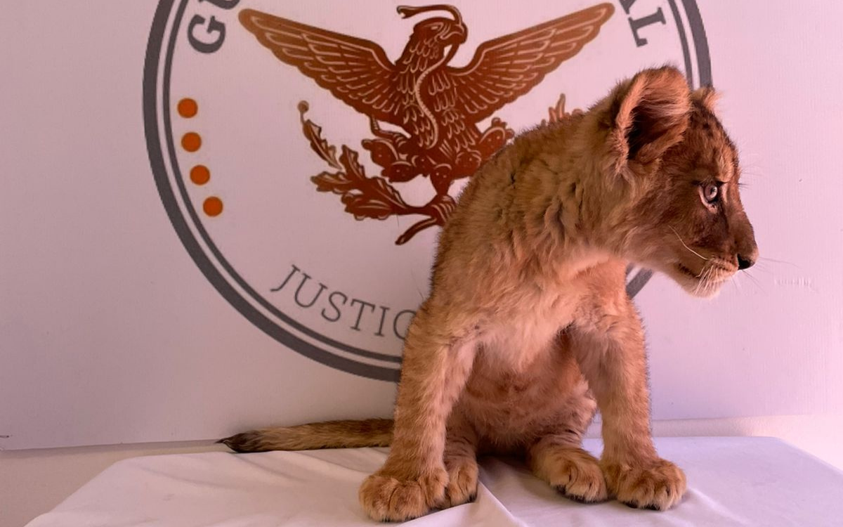 Una cachorra de león africano fue rescatada en el área de plataforma comercial del Aeropuerto Internacional de Ciudad Juárez, Chihuahua por integrantes de la Guardia Nacional.