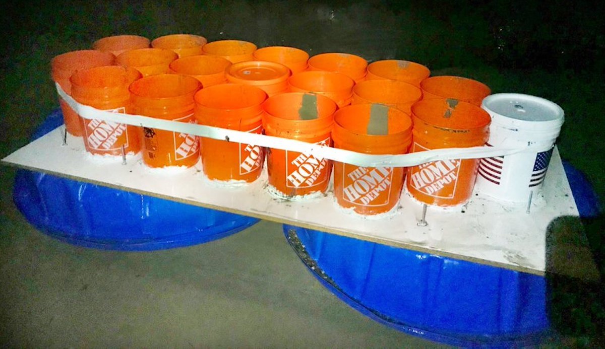El bote improvisado estaba unido con 20 cubos de Home Depot, dos piscinas de plástico para niños, madera contrachapada y cinta adhesiva, informó el San Luis Obispo Tribune.