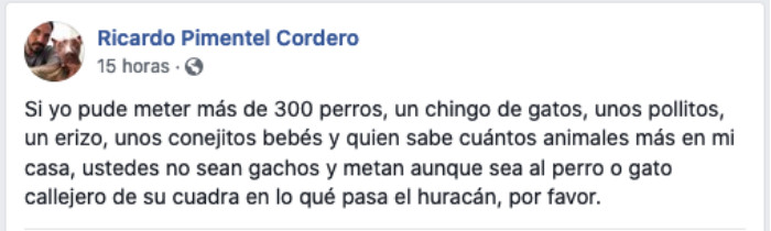 “Ustedes no sean gachos y metan aunque sea al perro o gato callejero de su cuadra en lo que pasa el huracán, por favor”, escribió Pimentel Cordero en Facebook luego de haber resguardado a decenas de perros, gatos, pollos, conejos, cabras, un erizo y más animales.