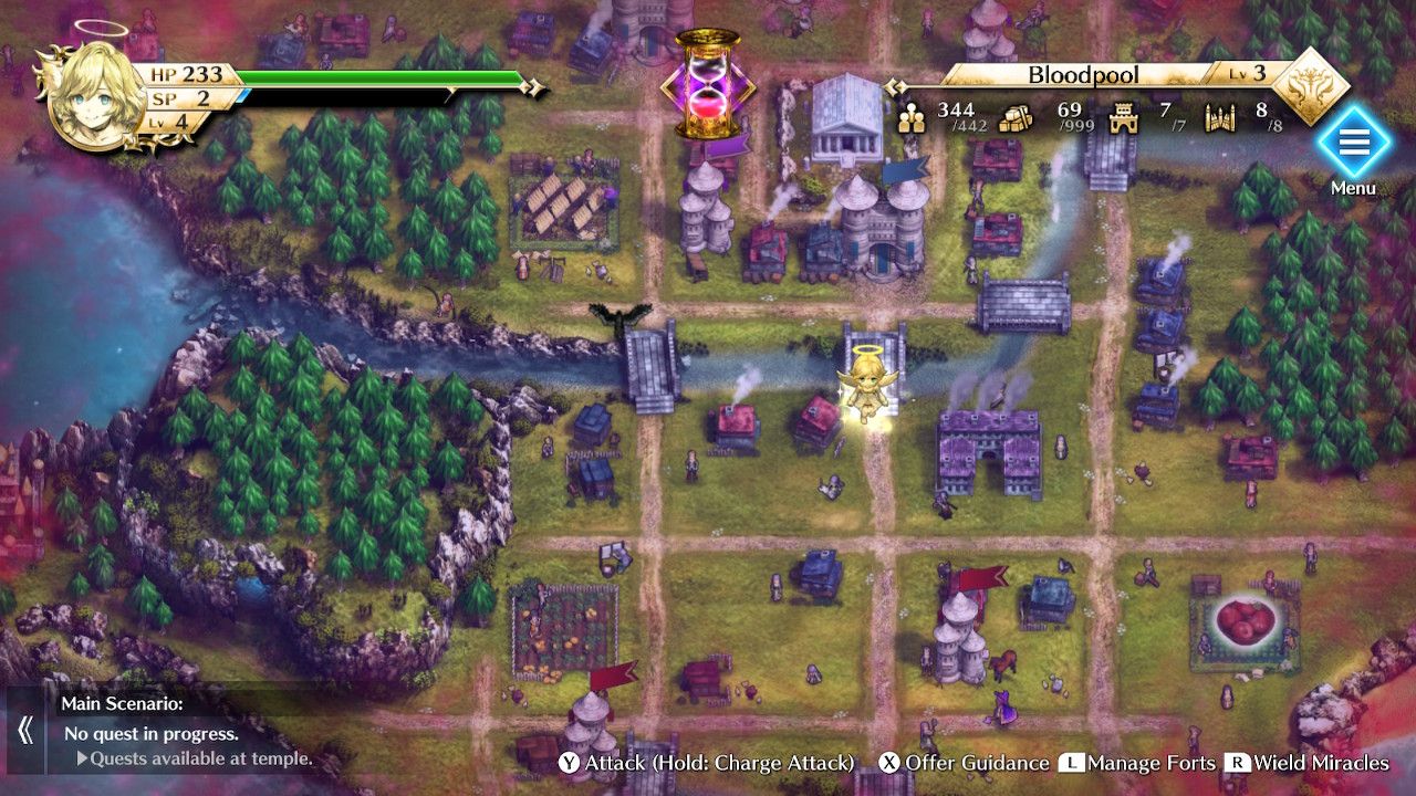 “/> Realm Management, por otro lado, es donde el juego da un giro audaz ya que estas secciones se desarrollan como un cruce entre un Juego de Dios y un RTS. Durante estos segmentos, que en realidad ocupan la mayor parte del tiempo de juego, el jugador pilota alrededor del ángel asistente del Señor de la Luz para ayudar en la construcción y el mantenimiento del asentamiento del reino. Esto se logra mediante la aplicación juiciosa de la guía divina para sugerir dónde deben construir los mortales, milagros divinos para ayudar a despejar su camino y la obtención de recursos con los que construir defensas.