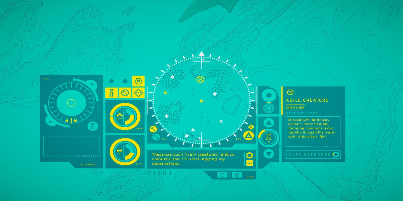 La jugabilidad básica de En otras aguas requiere alguna explicación: se reproduce casi en su totalidad a través de la lente de una superposición similar a un radar. Esta interfaz simple pero elegante permite al jugador establecer rumbos para Ellery, examinar muestras biológicas y más. Todo lo que hay en el mundo acuático, desde criaturas hasta puntos de interés, se muestra como galones resaltados acompañados de descripciones evocadoras. La estética de dos tonos se combina perfectamente con el diseño de sonido atmosférico, creando una experiencia excepcionalmente serena. Para bien o para mal, el juego no proporciona mucha identificación visual; Le pide al jugador que dé rienda suelta a su imaginación y visualice el mundo por sí mismo. En otras aguas transmite la sensación de un juego de aventuras de texto antiguo: de ritmo lento y prolijo, pero también intrigante y envolvente.