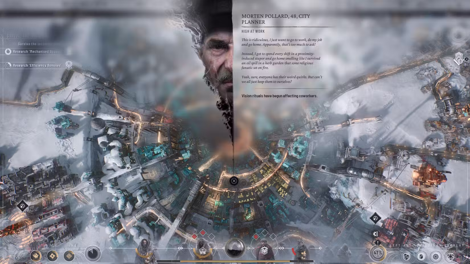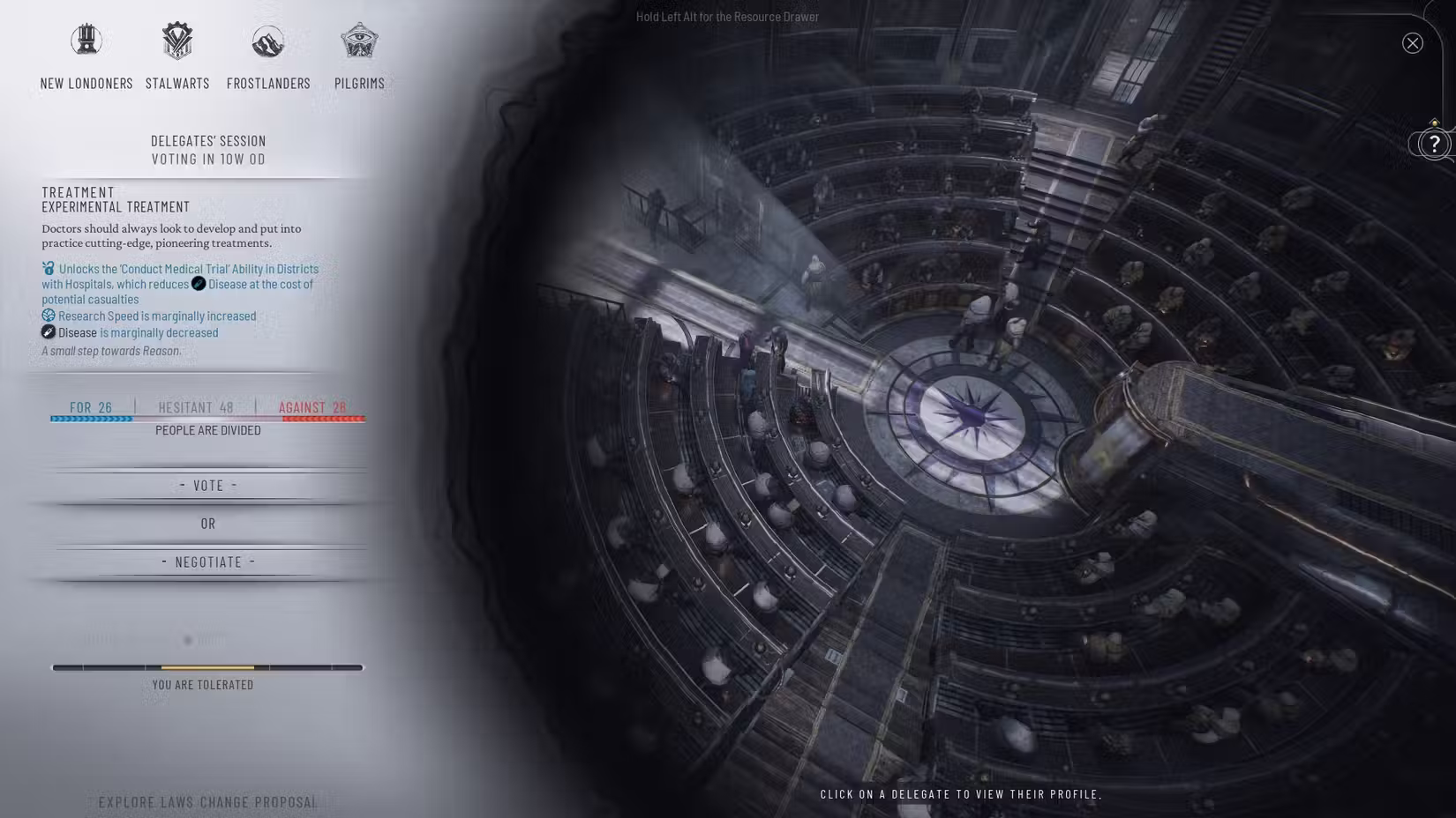 Al principio del juego, hay tres comunidades viviendo en la ciudad: Frostlanders, Stalwarts y New Londoners. Una secta de Frostlanders pronto se divide para formar los Pilgrims, una facción de fanáticos religiosos que tienen propuestas de cambio mucho más radicales que, al principio, me resultaron molestas. Eso fue hasta que tomé algunas decisiones que aprobaron y comenzaron a realizar reuniones que ayudaron a aumentar las cifras de Workforce y Heatstamp y a enviar videntes místicos a Frostland para descubrir nuevas tierras para mí; mi opinión cambió rápidamente después de eso.