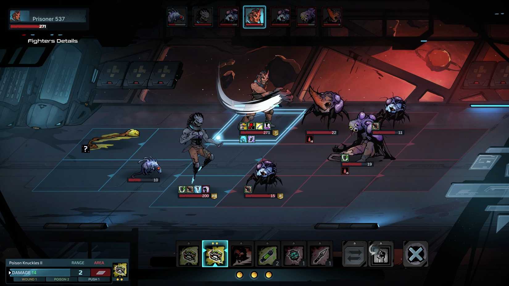 Luchando en Prisión espacial El juego se desarrolla en un sistema de cuadrícula, en el que cada raza comienza con un conjunto de movimientos ligeramente diferente. Muchos de ellos son de varios pasos, combinando elementos como movimiento y daño, y cuestan una cantidad determinada de puntos de acción. Con el tiempo, los jugadores pueden adquirir diferentes armas que cambiarán estas opciones de conjunto de movimientos, así como elementos como consumibles y ataques de un solo uso como proyectiles envenenados. El aspecto de múltiples pasos de los ataques combinado con la cantidad de movimiento necesaria para el éxito crea un combate por turnos que se siente único.aunque los conjuntos de movimientos iniciales limitados pueden volverse repetitivos cuando los jugadores cambian de cuerpo.