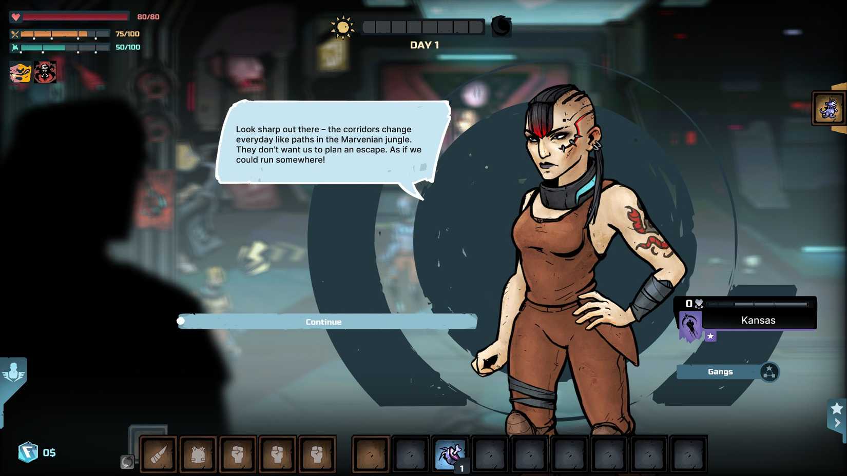 Prisión espacial Utiliza un ciclo de día/noche, en el que cada día se establece una cantidad determinada de acciones que se pueden completar antes de que los prisioneros deban regresar al bloque de celdas o enfrentar consecuencias nefastas; sin embargo, los jugadores no necesitan retroceder en el mapa y pueden regresar automáticamente. El mapa tiene el estilo típico de roguelike, mostrando caminos ramificados con combates o eventos, y Las peleas están marcadas con un nivel de dificultad, que puede ser invaluable cuando se viaja con poca salud.Los acontecimientos son simples pero entretenidos, aunque también pueden tener un gran impacto y a menudo provocar pérdidas de salud o mejoras en las relaciones.