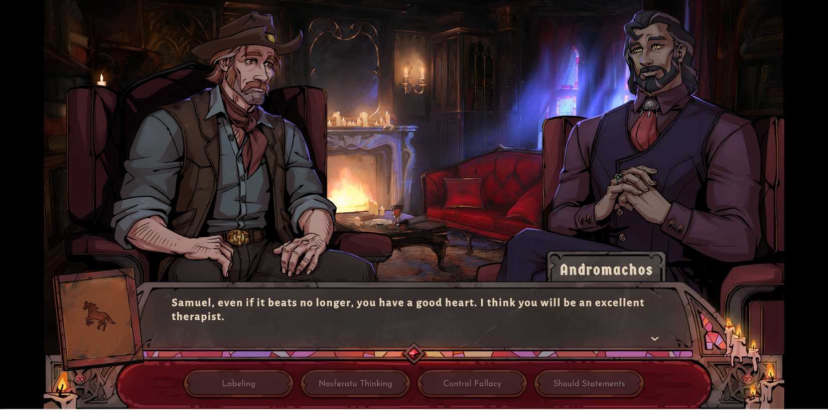 Sam, el personaje principal de la historia, es un vampiro que ha tenido un pasado difícil. Aunque está atormentado por su propia culpa, tiene una mente reflexiva que le permitió desarrollar sus propias ideas sobre lo que más tarde descubriría que eran distorsiones cognitivas. Después de entrar en contacto con un vampiro mucho mayor y más sabio llamado Andromachos, asume el papel de estudiante mientras trabaja también como terapeuta de otros vampiros. Andromachos le enseña a Sam, y al jugador, sobre las distorsiones cognitivas y ayuda a Sam no solo en su trabajo de terapia, sino también a lidiar con el propio dolor de Sam con respecto a su pasado.