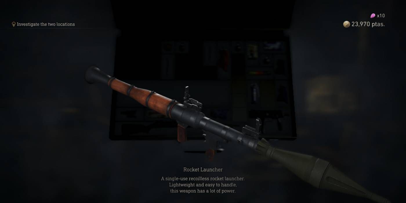 El Lanzacohetes estará disponible durante Capítulo 4, pero los jugadores deben realizar algunas tareas antes de que se desbloquee por completo. Primero, León tiene que combustible para el barco y matar al monstruo del lago Del Largo antes de que aparezca el arma en cuestión. Los jugadores pueden mejorar las herramientas que han adquirido hasta este punto para luchar contra el jefe, incluida la compra de mejoras de armas del comerciante intercambiando varias pesetasla moneda del juego obtenida al saquear cuerpos o vender artículos valiosos.