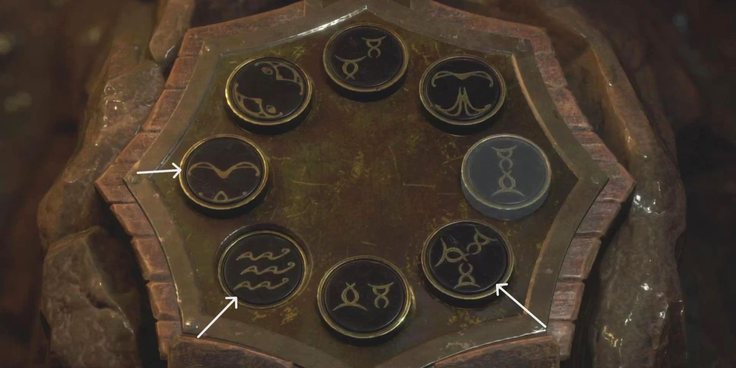 Después de que el área esté despejada, regrese a la escalera que Leon subió primero. En la parte superior, hay símbolos amarillos pintados en las paredes de la cueva. Hay tres en total, con el tercero pasando la puerta cerrada con llave en la pared al lado de la segunda escalera. Luego, Leon puede ingresar estos símbolos en el letrero interactivo al lado de la puerta cerrada. No importa en qué orden se escriban los símbolos, solo que coincidan con los símbolos pintados. por ejemplo, el los símbolos correctos se muestran en la imagen de arriba. Una vez que se colocan correctamente, la puerta se abrirá y Leon podrá entrar y agarrar la cabeza de la estatua.