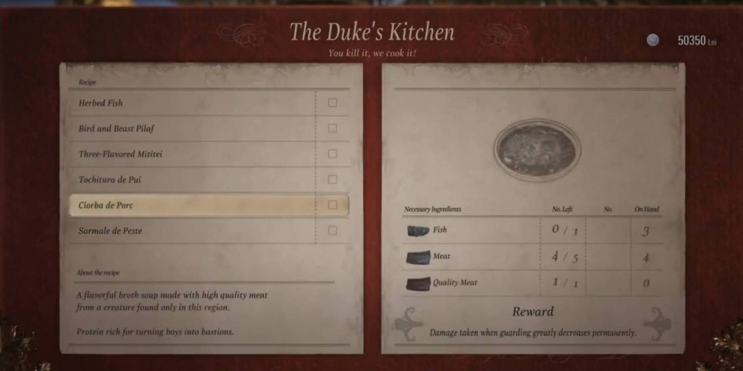 Tomarse el tiempo en una nueva partida para preparar cada comida disponible convertirá a Ethan en un protagonista más fuerte, brindándote las ventajas que necesitas para avanzar en la historia en una dificultad mayor. Encontrar diferentes animales legendarios te permitirá recolectar ingredientes legendarios para la comida más rara en la cocina del Duque. Una vez que hayas comido todo, puedes vender los ingredientes sobrantes, que continúan reapareciendo en el mundo.