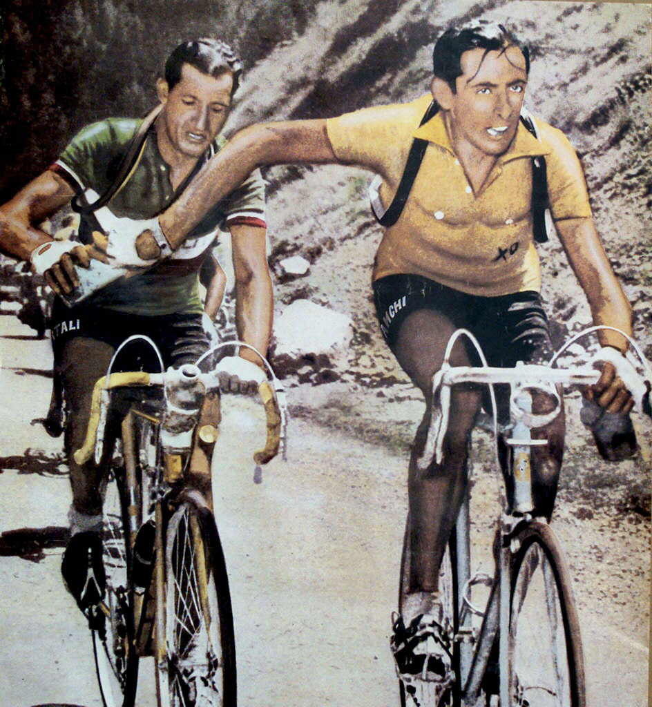 Como escribió Vázquez Montalbán, Bernardo Ruiz corría en bicicletas más de quinto culo que de segunda mano, y lo hizo después de una guerra que los suyos, su padre, sindicalista de UGT en Orihuela, habían perdido. Tiene 95 años y aunque apenas se puede mover y ya no baja a pasar el día al casino de su pueblo, como toda la vida hacía, sigue lúcido, y su memoria aguda.Y ahora, la pasada semana, le llama desde Italia el periodista Pier Bergonzi, responsable del Sporweek, el magacín semanal de La Gazzetta dello Sport, para que le ayude a desentrañar el misterio de la foto que para todos los italianos es La Foto, la instantánea que ampliada a tamaño póster gigante recibe a todos los deportistas en la sala de honor de La Gazzetta, la de Coppi y Bartali pedaleando en el Télégraphe el 6 de julio de 1952, domingo y mucho calor, Bourg d’Oisans-Sestriere, 11ª etapa del Tour, uno delante de otro, Coppi de amarillo y una botella de agua uniendo sus manos, el símbolo del altruismo y la deportividad entre los dos grandes rivales, más aún, el símbolo de la Italia reconciliada tras los años del fascismo y la guerra, la Italia campesina y conservadora, la Italia urbana, progresista, neocapitalista.El gesto no fue espontáneo, reveló años después el fotógrafo Vito Liverani, amigo del autor de la instantánea, Carlo Martini. “Carlo”, explicó hace unos años Liverani, “pidió permiso a Jacques Goddet, el patrón del Tour, para que le pudieran avituallar a Coppi en carrera, lo que estaba prohibido. Luego se adelantó a los corredores y se apostó en la cuneta junto a una joven que le dio a Bartali la botella de agua para Coppi, que llevaba el bidón vacío y poco después lo rellena”.En la foto original aparece a la derecha Stan Ockers, un diminuto belga, campeón del mundo, cuya imagen fue recortada cuando la imagen se hizo portada de revistas y póster, pues distraía del motivo principal, y ocultos, a rueda de Bartali, por las sombras negras sobre el asfalto cristalizado, se intuye que van algunos ciclistas más. Según las crónicas de la etapa, en el Télégraphe, a mitad de la ascensión del Galibier, se había ya creado un grupo con los dos italianos, Ockers, Bernardo Ruiz, el francés Raphaël Geminiani, el belga Alex Close y el mallorquín Antonio Gelabert. El más cercano a Bartali, ya un veterano de 37 años, casi 38, es el ciclista de Orihuela, el único del grupo aún vivo, junto a Geminiani, también nacido en 1925, aunque cinco meses más tarde. Ockers (1920), que terminó segundo aquel Tour, tras Coppi (1919-1960), murió pocos años después de una caída en el velódromo de Amberes, y Gelabert (1921), décimo en la general final, murió cuatro años más tarde en accidente de automóvil.Del principal misterio de la foto, misterio ya resuelto hace años, y fue Bartali, el católico, el que le pasó el agua a Coppi, el ateo, habla poco Bernardo, que tampoco le da tanto valor al gesto —”era algo habitual ayudarse entre compañeros de equipo y, además, Coppi era tan magnífico que si hubiera necesitado agua se la habría dado yo mismo”, recuerda Ruiz—, aunque sí precisa que la foto se tomó en el Télégraphe, y no en el Galibier como siempre se había creído. “Poco después atacó Coppi y se fue solo, yo intenté resistir a su rueda pero acabó conmigo”, recuerda Bernardo, gran admirador de Coppi, el más grande. “Llegué segundo a la meta de Sestriere, 90 kilómetros más allá, a más de siete minutos del campionissimo. Me hice amigo suyo, y después hice la ronda de critériums con él, que tuvo la amabilidad de llevarme en su coche a todas partes, aunque no le pagué muy bien el favor pues unas semanas después me caí en el velódromo de Perpiñán y arrastré a Fausto conmigo, y se rompió una clavícula”.Bernardo había ganado la Vuelta del 48 y en el Tour anterior, el de 1951, ya se había impuesto en dos etapas. “Por eso, el del 52 me lo planteé para luchar por la general”, recuerda el ciclista de Orihuela, la gran figura del ciclismo español de posguerra antes de la explosión de Poblet, Loroño y Bahamontes. “Yo me sentía como un intruso entre tanta figura, así que me marqué una estrategia de marcaje rotativo con ellos, siempre intentando no molestar a nadie para que nadie me diera a mí batalla. Acabé tercero el Tour, el primer español que subió al podio”.