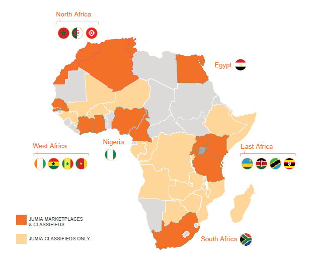 Fundada en Lagos en 2012 con Rocket Internet. Respaldando, Jumia ahora opera múltiples verticales en línea en 14 países africanos. Las líneas de productos y servicios incluyen Jumia Food (un servicio de comida para llevar en línea), Jumia Flights (para reservas de viajes) y Jumia Deals (para clasificados). Jumia procesó más de 13 millones de paquetes en 2018, según datos de la compañía. La compañía ha comenzado a generar ingresos anuales de más de $ 100 millones, pero al igual que muchas empresas nuevas con tasa de quema, lo ha hecho mientras acumula grandes pérdidas.