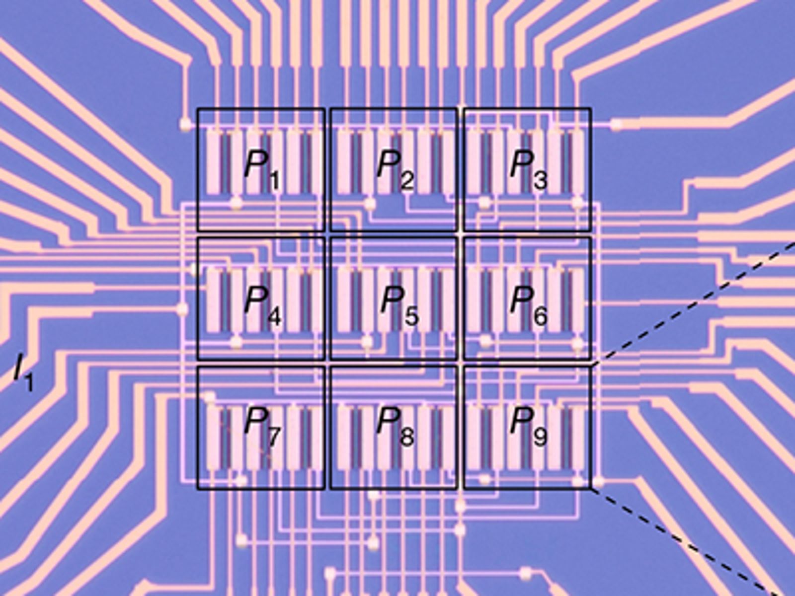 El chip, dividido en varias subáreas, que se especializan en detectar diferentes formas.