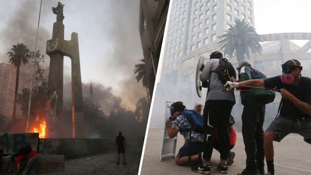 En las calles aledañas a la Plaza Italia algunos grupos de manifestantes se enfrentaron a Carabineros con piedras y cócteles molotov e hicieron retroceder a los efectivos policiales que resguardaban el monumento al cuerpo uniformado, a unas dos cuadras de la plaza.