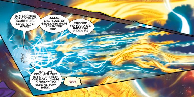 En 2017 Thor poderoso # 19, por Aaron, Russell Dauterman y Matthew Wilson, el Dios del Trueno se enfrentó cara a cara con la Fuerza Fénix junto al Mighty Thor de Jane Foster, quien en ese momento estaba empoderado por Mjolnir. La energía psíquica liberada durante la confrontación le permitió a Jane sentir las mismas emociones del Fénix, y estaba más que un poco conmocionada. “El torrente de emociones“ella gritó.”Rabia y deseo y … Odinson … ¿alguna vez saliste con el Fénix?Thor se negó a comentar, comprensiblemente incómodo al discutir las relaciones pasadas con otro ex.