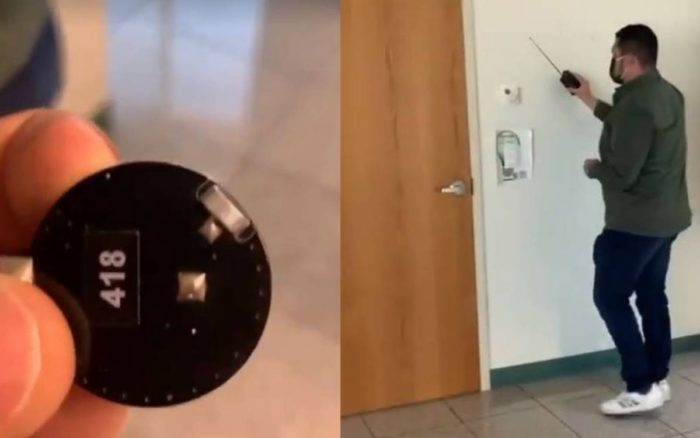 En el video García muestra uno de los micrófonos encontrados y cómo se buscan más aparatos como estos.