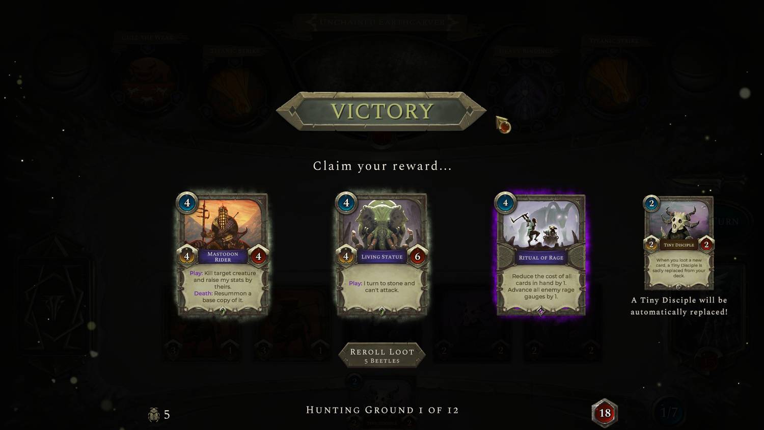 Después de seleccionar las clases, los jugadores se embarcarán en un camino único de 12 cotos de caza donde recogerán ofrendas de los jefes mientras se dirigen al altar. En el nivel de dificultad básico, comenzarán con 20 de salud, que se cura en uno después de cada ronda, excepto para los empiristas, que se curan en 3, y una baraja de 20 cartas llena en gran parte de Tiny Disciples. El tamaño total del mazo nunca bajará de 20, y Tiny Disciples será reemplazado por recompensas de cartas con el tiempo; Una vez fuera de estos, los jugadores tendrán que elegir las eliminaciones manualmente..