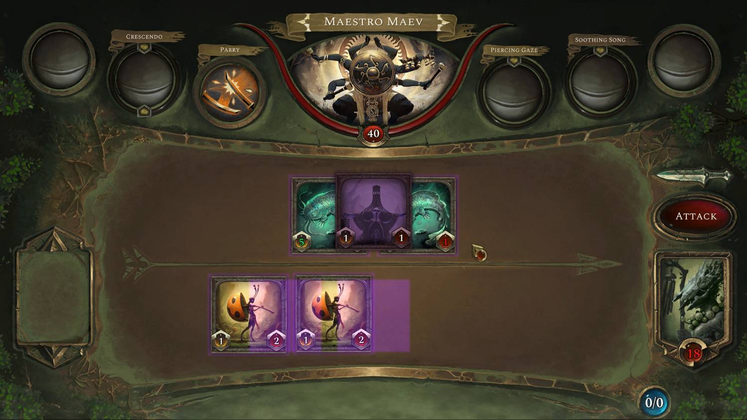 Sin embargo, a diferencia del creador de mazos antes mencionado, el orden es fijo y no todos los aliados tienen que atacar en cada turno, sino que deben moverse manualmente hacia una fila de ataque. Esto permite algunas estrategias interesantes con respecto a la ubicación de los personajes y mecánicas divertidas como Overlord, que son habilidades especiales que se activan cuando las criaturas no atacan. La forma en que los enemigos luchan es una visión refrescante del combate, ya que cada jefe tiene un conjunto de ataques y habilidades a su alrededor que funcionan en un sistema de cronómetro por turnos, que se despierta y se activa con el tiempo.