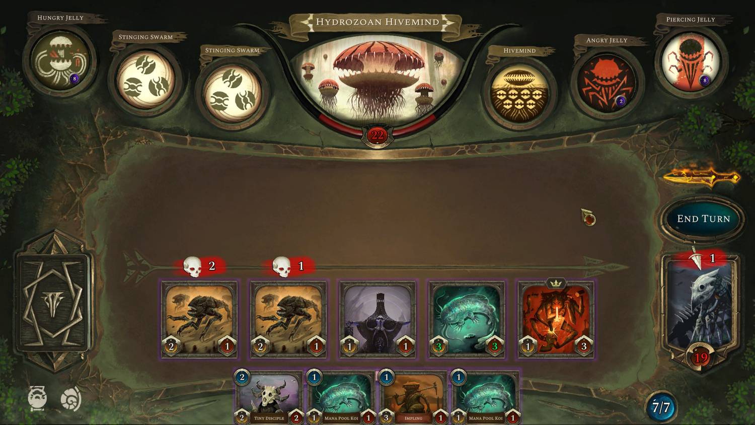 Las cartas de criaturas y hechizos que los jugadores tienen a su disposición para derrotar a estas bestias abarcan varios arquetipos divertidos y tienen muchas palabras clave divertidas con las que jugar. Algunos de ellos son más comunes, como Charge, pero también otros completamente nuevos, como Infest, que funciona con cartas llamadas Metamorphose con resultados deliciosamente devastadores. La forma en que el mazo híbrido de clase de un jugador funciona junto con estos también permite un buen espacio para la creatividad, como combinar los diablillos de Devastador con la manipulación de la salud de los empiristas para crear alineaciones sólidas.