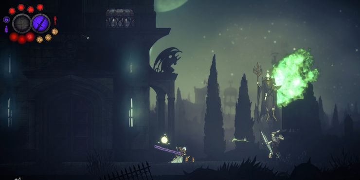 Del mismo modo, las plataformas en Noche eterna es igual de frustrante. Esto es principalmente un problema en mazmorras y áreas secretas, donde hay muchos obstáculos en movimiento con grandes hitboxes o plataformas pequeñas con mucha distancia entre ellos. Noche eterna no proporciona una sensación de control total del aire o trayectoria en la forma en que algo como Fuego azulLas plataformas precisas lo hacen. Los obstáculos en movimiento son los principales culpables en este sentido gracias a sus aparentemente grandes hitboxes que dejan muy poco tiempo o espacio para que el jugador navegue. Esta será probablemente la principal causa de muerte para muchos jugadores y les dará a conocer rápidamente Noche eternaElementos parecidos a las almas.