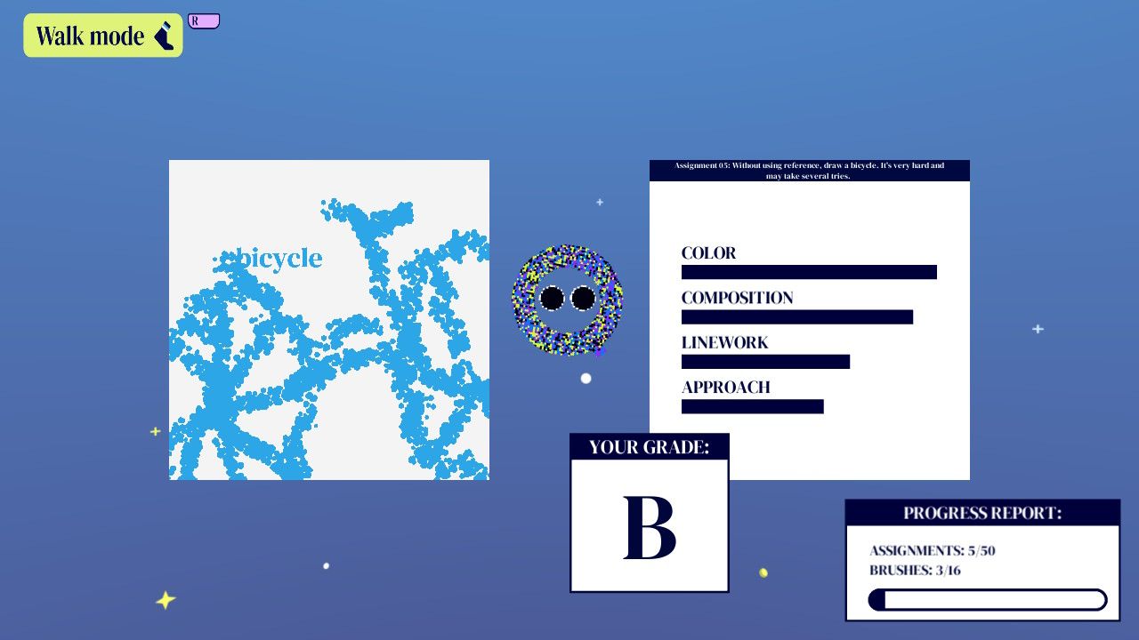 La calificación de Qwertz parece ser casi completamente aleatoria. Aunque rara vez es suficiente entregar una hoja en blanco, Escuela de Arte Los jugadores pueden ignorar cualquier instrucción con seguridad y simplemente dibujar lo que quieran en cualquier momento. Las indicaciones son concisas y directas, pero reflexivas: “Dibuja la última persona a la que le dijiste ‘te amo’”, “Dibuja algo de arriba hacia abajo”, “Dibuja un juguete que recuerdes”, etc. Aún así, no hay un algoritmo tremendamente complejo que pruebe la entrada del jugador bajo el capó, y Qwertz analiza cualquier tontería amorfa que se entregue antes de convocar una calificación con letras, que no equivale a mucho.