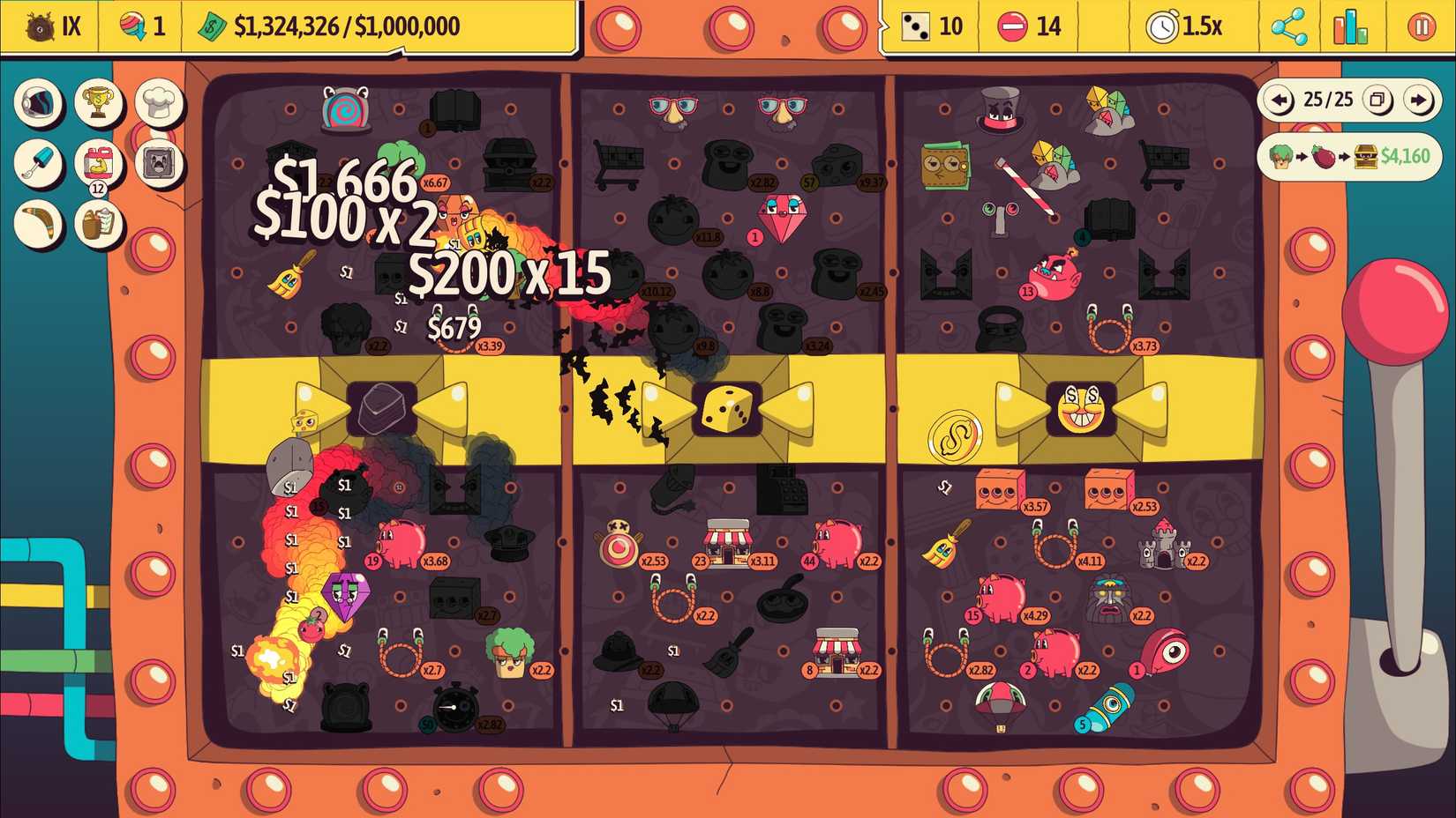 Sin embargo, cada bola perdida proporciona un borrador de una variedad cada vez mayor de activadores, impulsores o poseedores. Con siete caídas por ronda, el tablero eventualmente se transforma en una red ocupada de creciente potencial de puntuación, con totales más altos necesarios para pasar a la siguiente. Las bolas pueden rebotar, dividirse, transformarse, teletransportarse, desintegrarse, equipar elementos y propiedades elementales, luego interactuar con otras superficies y (con suerte) desencadenar una gran cantidad de efectos y multiplicadores de puntuación.