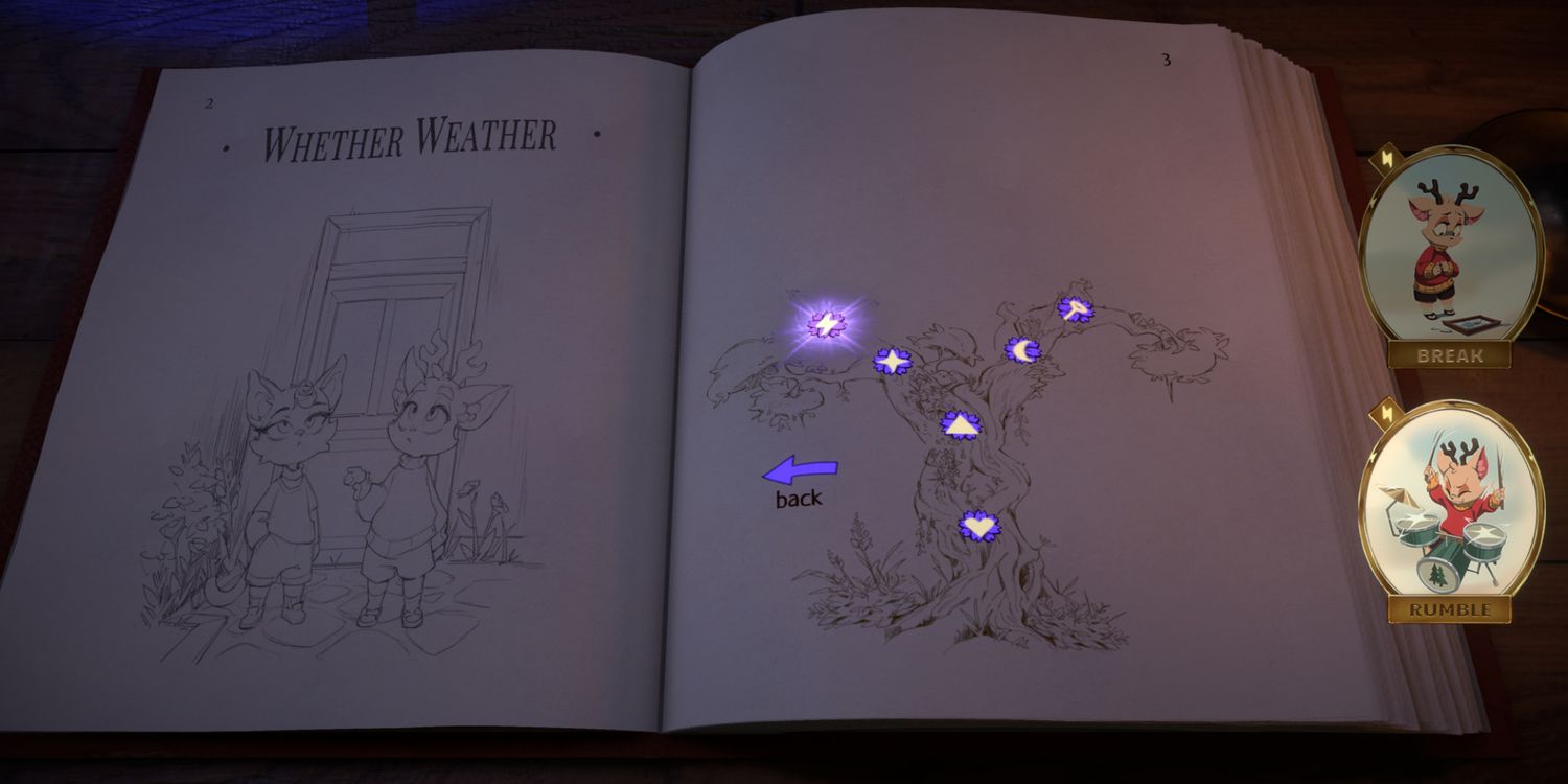 En Pinos faro, los amuletos son como insignias de mérito que representan las diversas palabras que estarán disponibles en ciertos escenarios, junto con ilustraciones para aclarar la emoción precisa asociada a la palabra. Cuando llega el momento de tomar una decisión impactante, los jugadores reciben dos o tres opciones que se ajustan al escenario dado. Las decisiones tomadas crearán “ramas”, que se representan en el libro como un árbol ilustrado con flores que representan el momento en que se toma una decisión. Lo que hace que los amuletos sean tan inteligentes es que solo se pueden obtener explorando Beacon Pines e interactuando con todos los que viven en él. Esta elección de diseño anima a los jugadores a explorar el mundo semiabierto y aprender dónde está todo, ya que no hay mapa, así como a conocer realmente a toda la gente del pueblo y sus ricas personalidades.