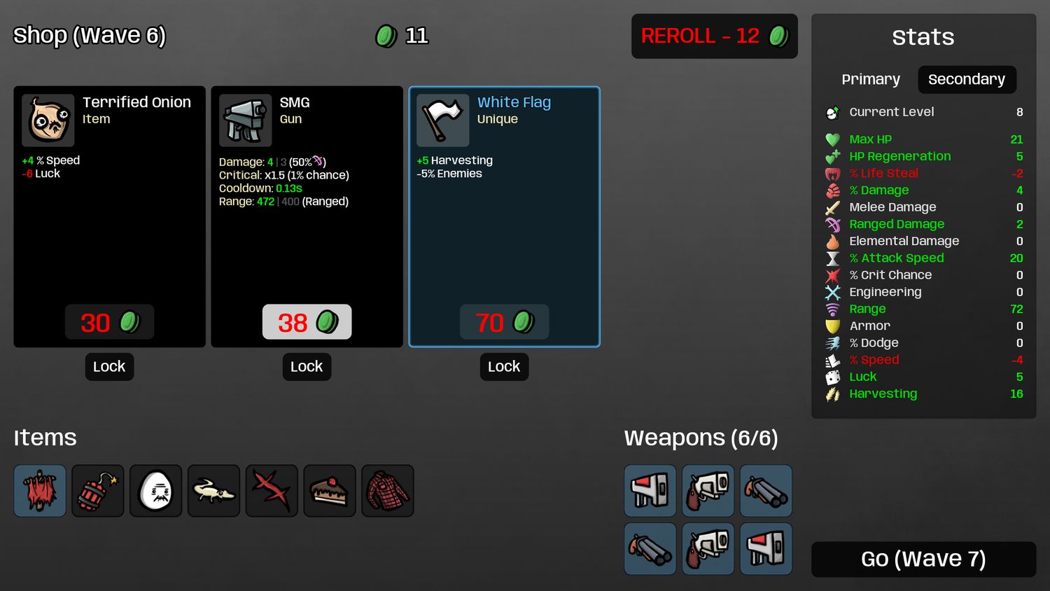 rondas de Brotato pueden durar hasta 30 minutos y comienzan con los jugadores eligiendo entre docenas de personajes desbloqueables, armas iniciales y el nivel de peligro de la carrera. Completar una carrera desbloqueará el siguiente nivel de dificultad hasta Peligro 5. Las clases de personajes como Mutant y Old admiten beneficios que ayudan a que el combate sea un poco más fácil, pero también tienen desventajas que hacen que los enemigos sean más rápidos o comprar artículos más caros. Algunos personajes solo pueden empuñar armas desarmadas. En cambio, otros pueden especializarse con otros tipos específicos como armas a distancia o elementales. Ciertas combinaciones de armas y habilidades de los personajes ayudan a los jugadores a sentirse imbatibles durante las primeras rondas, pero eso no dura mucho.