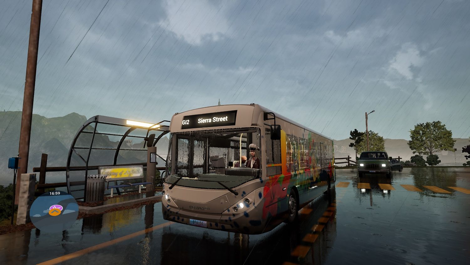 Cualquiera que haya jugado un juego de conducción estará familiarizado con la jugabilidad más básica. Simulador de autobús 21. Los gatillos gestionan la aceleración y la frenada, mientras que los joysticks controlan la cámara y la dirección. Por supuesto, un autobús es mucho más grande que un coche y requiere algo de tiempo acostumbrarse a él, especialmente en lo que respecta al radio de giro. Donde la cosa empieza a complicarse es con toda la mecánica extra que tiene un autobús respecto a un vehículo estándar. Para recoger pasajeros, los conductores tienen que abrir puertas, extender rampas, cobrar a quienes suben e incluso decidir qué luces encender y apagar.