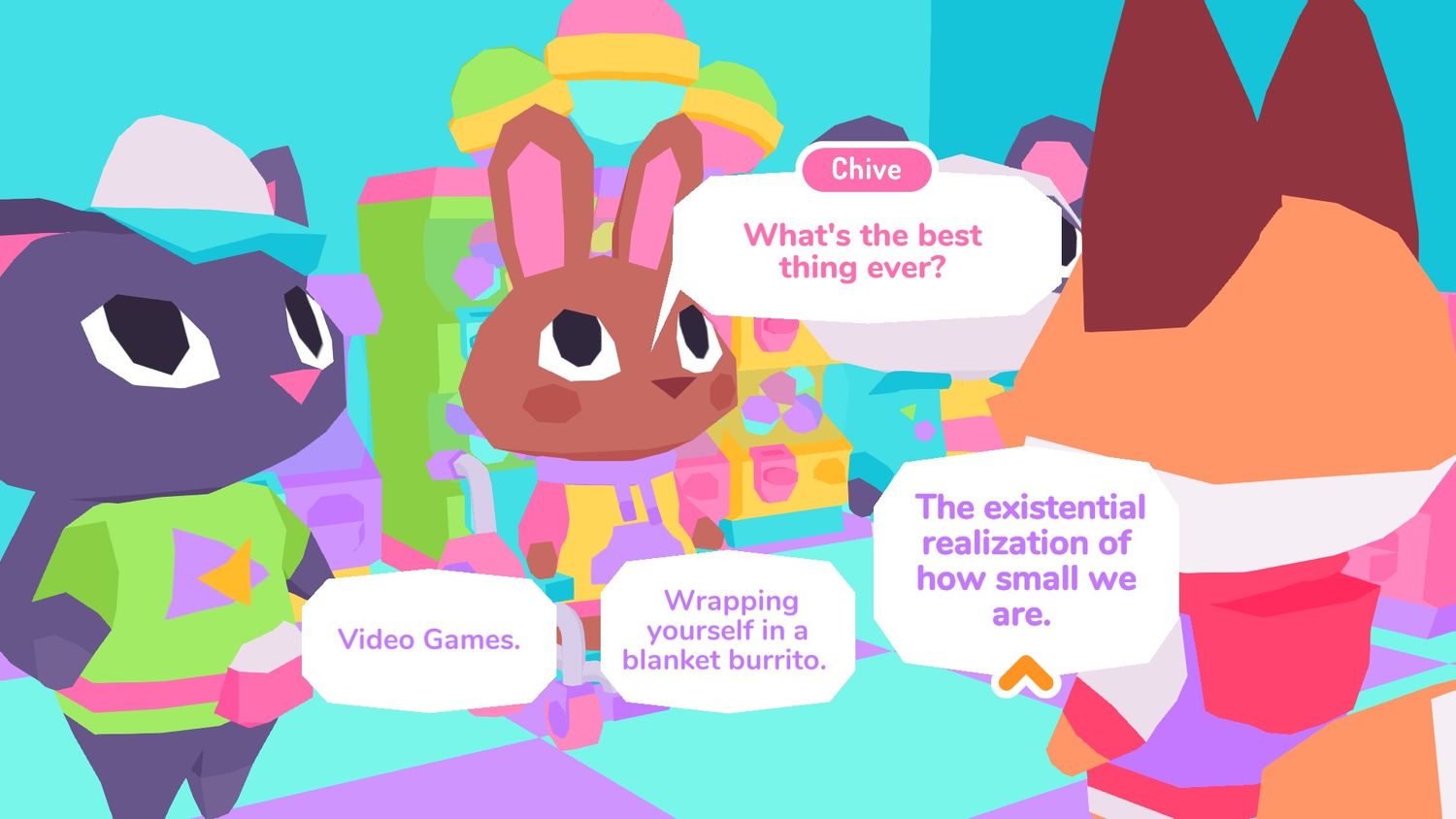 El que destaca entre ellos es fácilmente Prisma Beats, que, al ser un minijuego, es un juego más que útil. DDR clon con una sorprendente cantidad de canciones. La brevedad de estos juegos se alivia un poco al agregar rejugabilidad gracias a la inclusión de “Fluff Buffs”, que son elementos que se pueden usar antes de jugar cualquiera de los juegos de arcade y que agregan desde cambios estéticos hasta nuevos modos de dificultad y juego. Aunque estos juegos son en su mayoría la guinda del pastel de la historia, definitivamente hay suficiente para que los jugadores se involucren bastante.