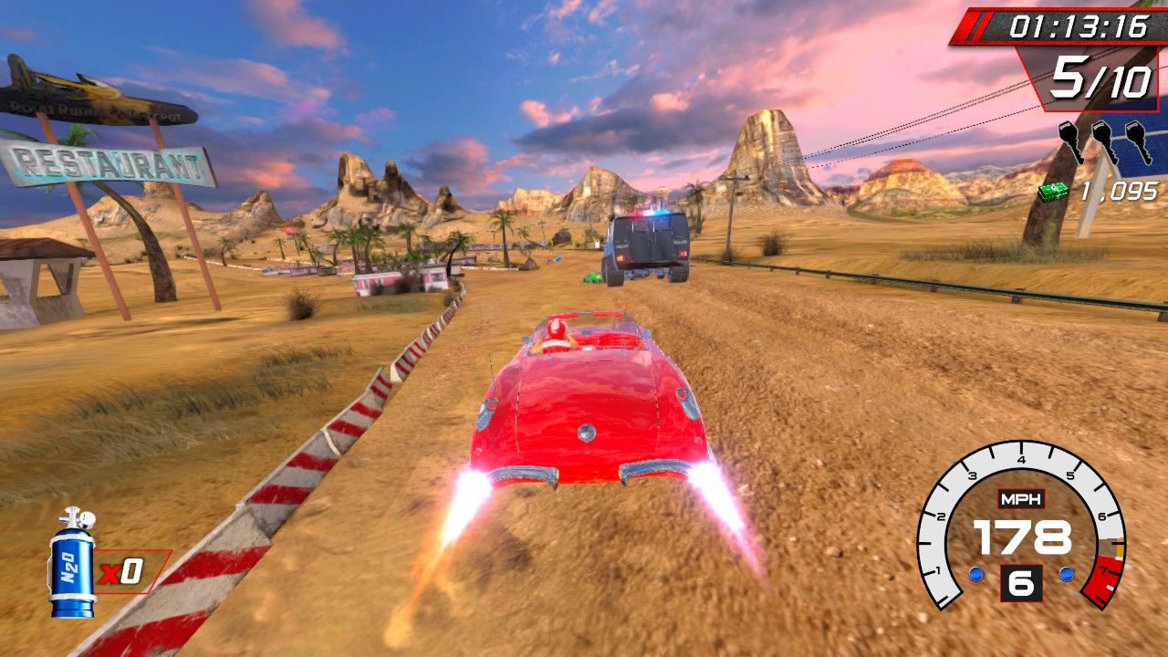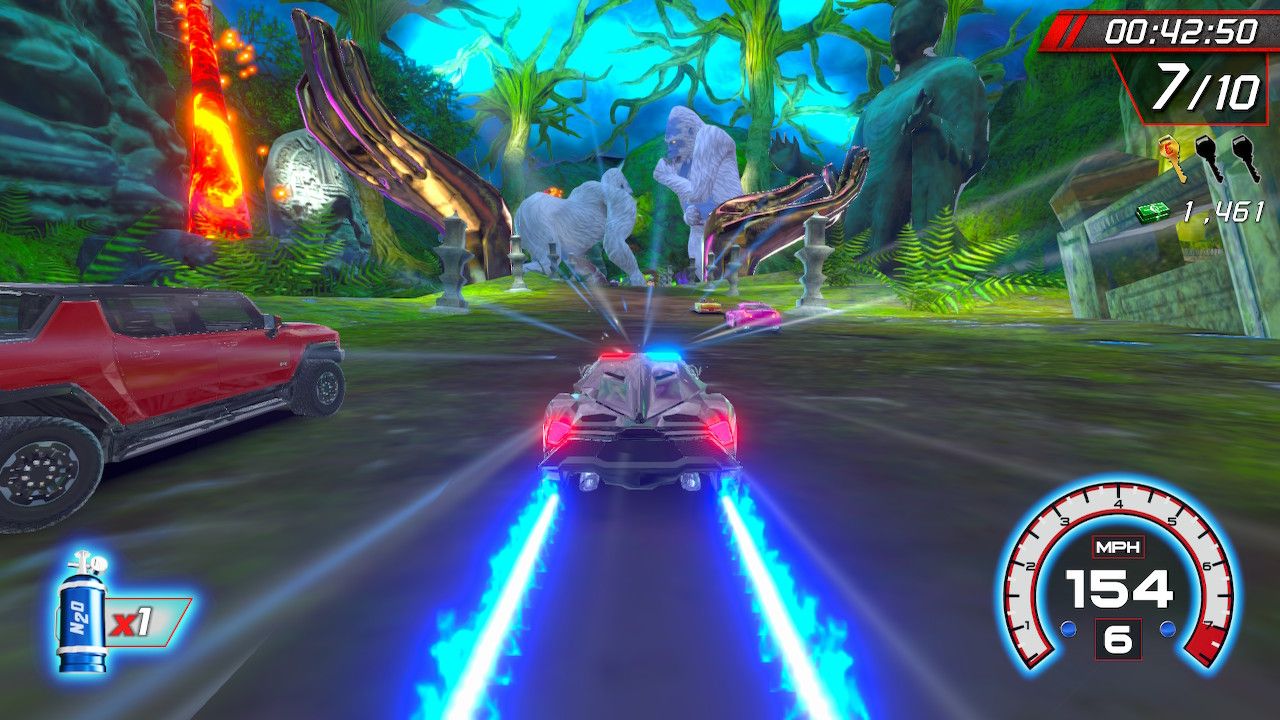 Aunque la lista de “casi 30” pistas en Cruis’n BlastLa página de la tienda puede parecer impresionante al principio, pero en el mejor de los casos el número está inflado. La mayoría de los juegos de carreras utilizan circuitos en modo espejo y temas similares para reutilizar secciones de la pista de una manera que al final se sienta fresca. Cruis’n Blast intenta hacer algo similar pero termina inclinándose demasiado hacia la reutilización de contenido. Las dos últimas copas del juego están dedicadas a inyectar criaturas prehistóricas y ovnis en pistas que, por lo demás, parecen casi idénticas a las anteriores, y hay varias otras repeticiones escondidas entre el resto. Hace que el modo campaña sea mejor en ráfagas cortas, y mezclar Cadillacs y dinosaurios es ciertamente un ganador, pero las sesiones más largas pueden comenzar a alargarse debido a la cantidad de Explosión comienza a resultar familiar después de unas pocas horas.