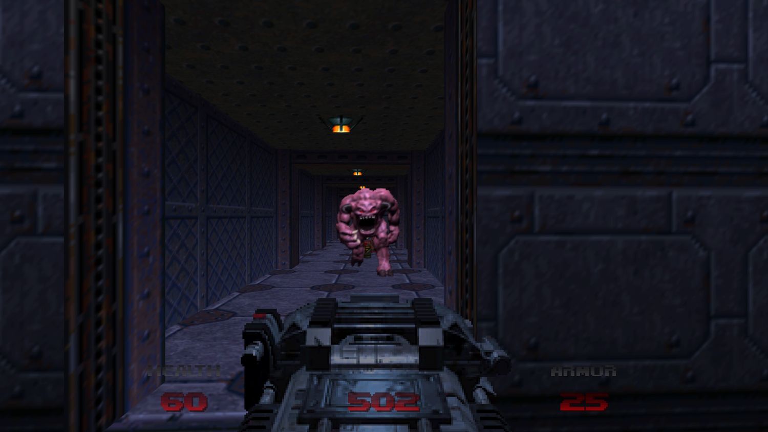 Aunque los controles se han actualizado para que coincidan con los controladores de diseño más ergonómico de hoy, el Doomguy de CONDENACIÓN 64 Todavía no puedo saltar ni mirar hacia arriba y hacia abajo, algo a lo que los nuevos jugadores (o los jóvenes que no recuerdan las primeras mecánicas de FPS) tardarán un poco en acostumbrarse. Disparar a un enemigo en el aire simplemente requiere apuntar el arma en su dirección y apretar el gatillo, sin necesidad de ajustar el eje Y. La mecánica de progresión de guardado original del juego, un sistema de contraseña destacado en los títulos de la época, ha regresado, pero CONDENACIÓN 64 También se puede guardar manualmente en cualquier momento a través del menú de pausa del juego, lo cual los jugadores deberán recordar hacer porque no se incluye un sistema de guardado automático y detenerse para escribir una contraseña después de completar cada nivel es increíblemente emocionante y mata la inmersión.
