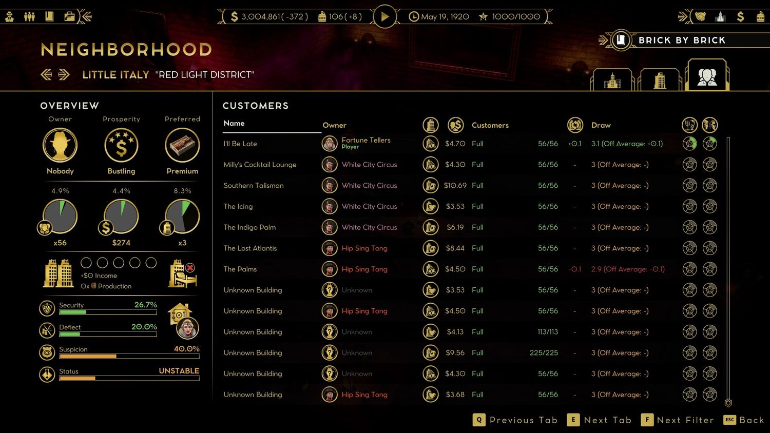 Afortunadamente, la mayoría de las peleas que involucran al grupo del jugador son significativas porque resultan en la adquisición de raquetas. Hay varios tipos diferentes de fraudes en los que convertir un edificio una vez que ha sido confiscado a bandas rivales o matones, y equilibrar con éxito bares clandestinos, cervecerías y burdeles es clave para un imperio exitoso. Para maximizar su valor, los jugadores pueden incluso estudiar la situación financiera de un vecindario determinado y asegurarse de que están produciendo la calidad adecuada de alcohol para la clientela adecuada. Sin embargo, mantener un margen de beneficio aceptable no es demasiado difícil, y es más probable que los jugadores ocasionales se salten el trabajo financiero en profundidad, ya que no serán penalizados por hacerlo.
