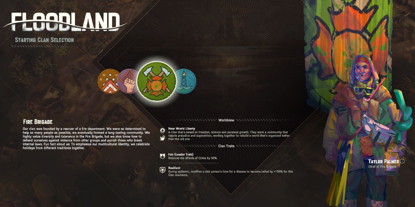 Qué tierras de inundación Lo que hace increíblemente bien es sumergir al jugador en su mundo. Inmediatamente, los jugadores elegirán uno de los cuatro clanes iniciales, lo que les dará una idea de sus visiones del mundo, así como de los rasgos específicos que cada uno aporta. Luego, el juego lleva al jugador a un pequeño campamento con solo unos pocos supervivientes para trabajar. Las tierras son pequeñas y están rodeadas de niebla y agua, lo que obliga al jugador a comenzar inmediatamente a explorar áreas adicionales en busca de más recursos para sobrevivir.