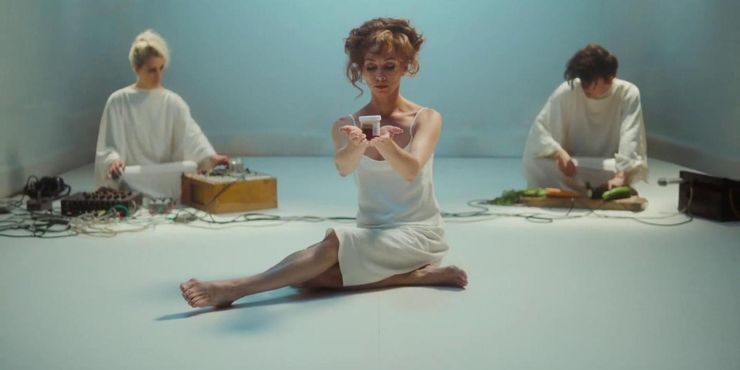 Las tomas largas, el ritmo más lento y las imágenes repulsivas son técnicas más comunes en el terror que invita a la reflexión, pero Flujo Gourmet no es una pelicula de terror. Sin embargo, implementa sabiamente ciertas elecciones de tomas y vestuario para pintar una sensación espeluznante que imita el horror de una manera inteligente. La estrella secreta de Flujo Gourmet es Papadimitriou, quien narra estas imágenes no con poesía del siglo XVIII sino con sus pensamientos internos sobre el hecho de que su personaje no puede dejar de tirarse pedos. Teniendo en cuenta que la banda usa la comida como instrumento, es un poco exagerado, pero también es absolutamente divertido. El público realmente no sabe lo que obtendrá de una escena a otra y es emocionante.