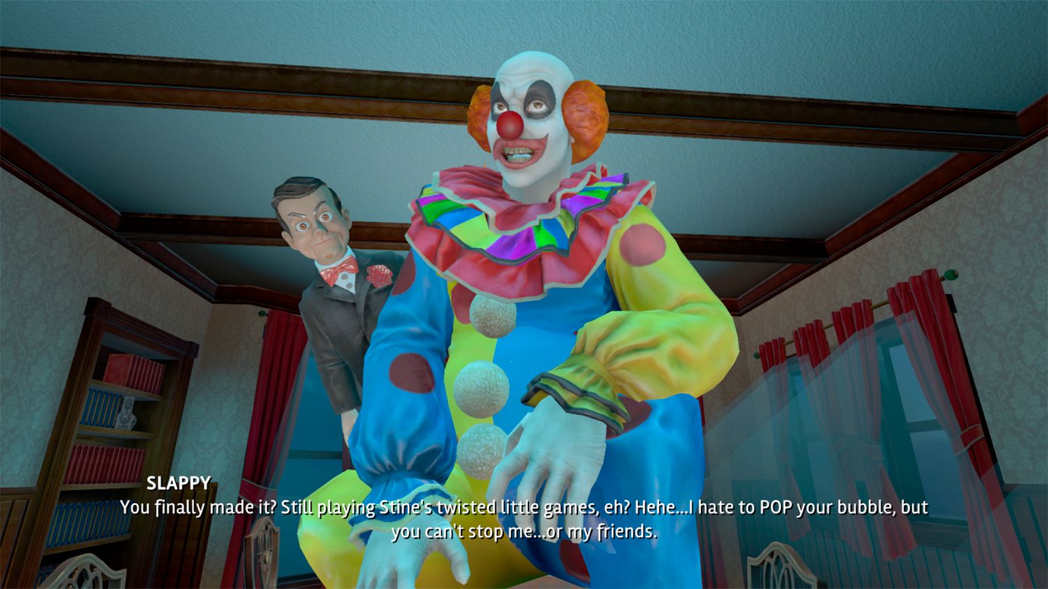 Inmediatamente surge el miedo a lo desconocido. La mansión de Stine está patrullada por monstruos errantes que matarán a Twist si se les da la oportunidad. El jugador puede examinar los libros destruidos para que Stine describa los horrores que le esperan con mayor detalle. La tensión aumenta a medida que se liberan más monstruos… pero luego se desvanece rápidamente una vez que el jugador aprende a eludir a cada enemigo. Todos los monstruos de Stine siguen el mismo patrón y su IA es fácil de burlar. Si un monstruo ve Twist, todo lo que necesita hacer es agacharse dentro de un escondite y el monstruo eventualmente se irá. Incluso cuando se escondan frente a un monstruo, olvidarán que alguna vez vieron a Twist. Esto hace que los monstruos se sientan inofensivos, pero aún así es genial poder ver las creaciones de Stine cobrar vida.