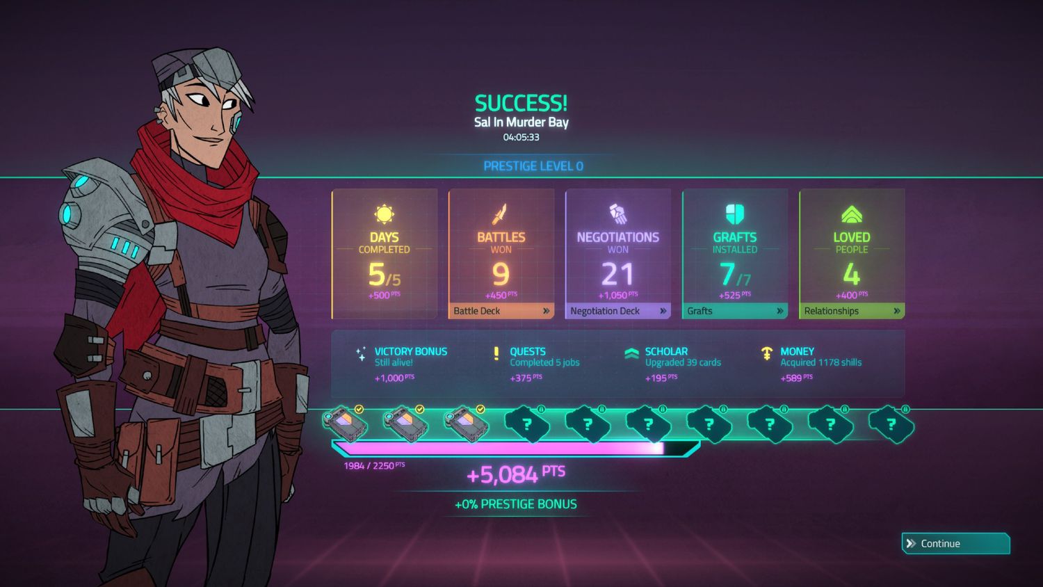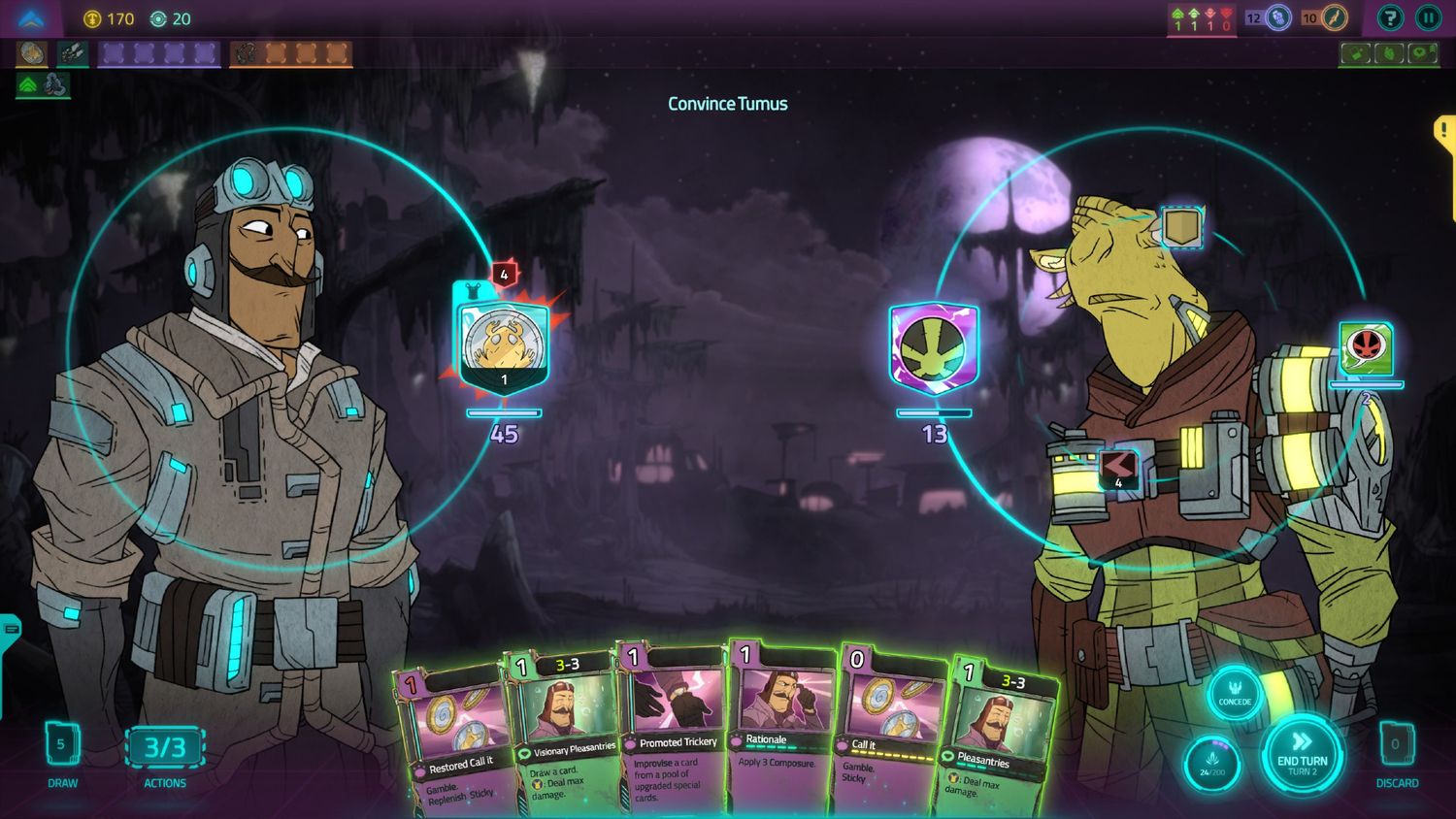 “/> Cada personaje tiene dos mazos, uno para batalla y otro para negociación. Si bien algunos encuentros están programados de manera que la batalla sea inevitable, muchos permiten elegir entre negociación o combate. Cada mazo se puede construir para que funcione con un enfoque diferente, y recursos como cartas adicionales e “injertos” (potenciadores) se recolectan a medida que avanza el juego. Las cartas se actualizan mediante eventos aleatorios o simplemente jugándolas repetidamente durante el transcurso de un viaje.