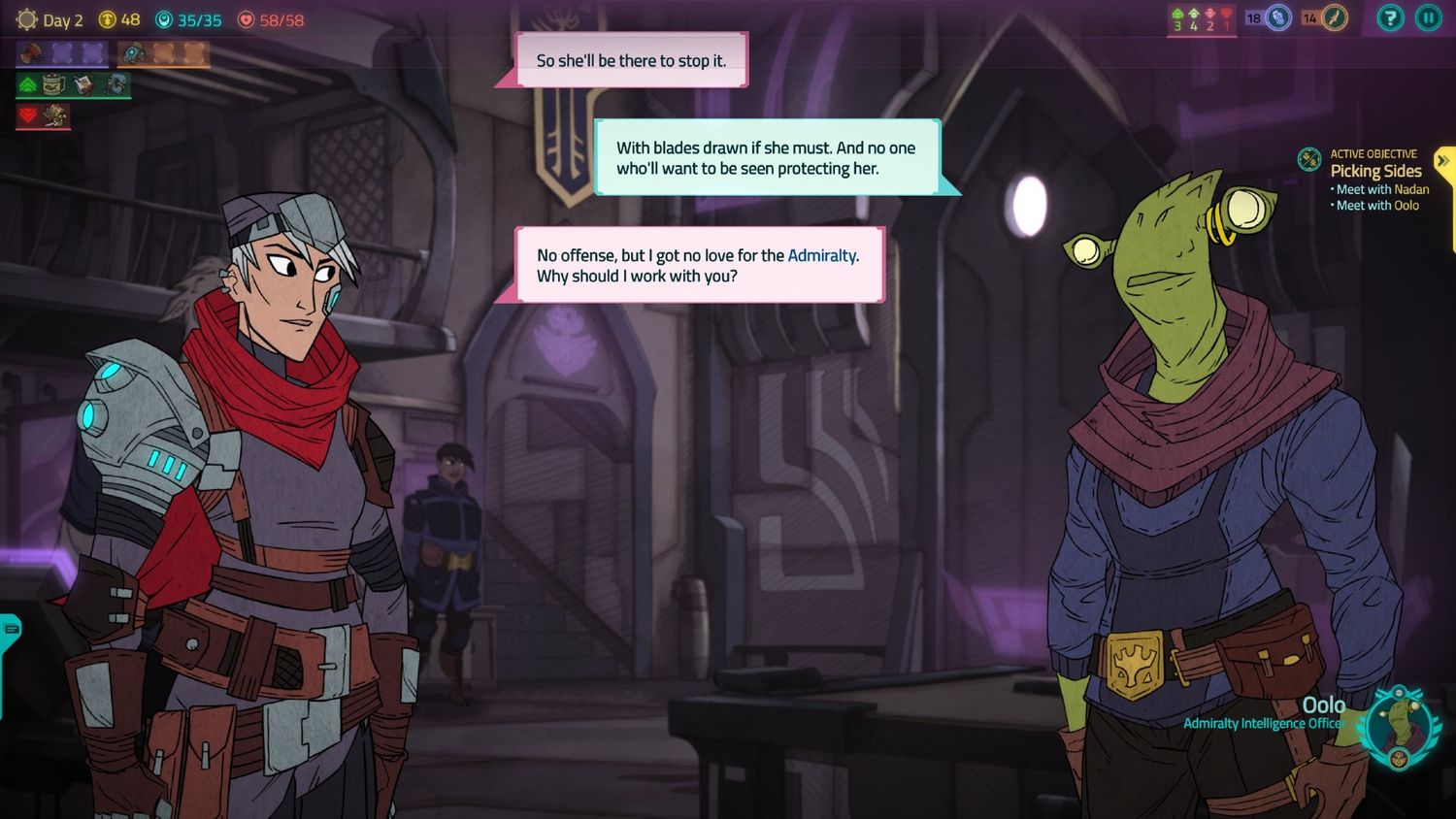 Tierras de Grift También tiene un mapa del mundo que permite a los jugadores visitar una variedad de lugares, ya sean tiendas o campamentos. A medida que se desarrolla la historia, se les dará la oportunidad de descansar para curar heridas (combate) y fortalecer su determinación (negociación), y los días que avancen desbloquearán misiones, circunstancias y recursos adicionales. Si un jugador muere, tendrá la oportunidad de regresar con ventajas de una carrera anterior, y un sistema de progresión en todo el juego hace que los personajes sean más poderosos cuantas más carreras hayan realizado. Es algo estándar de construcción de mazos de roguelike, pero está ejecutado de una manera cautivadora.