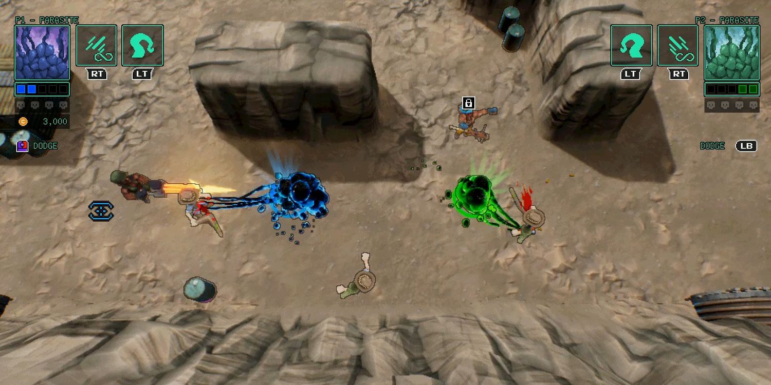 Hiperparásitos El juego es simple pero satisfactorio. Como tirador con dos joysticks, los jugadores pueden moverse con el joystick izquierdo y controlar sus ataques con el derecho. El giro es que los jugadores pasarán el juego jugando como un alienígena parásito que es capaz de poseer enemigos para poder usar sus ataques. Esto es parte integral de Hiperparásito ya que el extraterrestre es débil y morirá rápidamente sin un huésped. La misión tutorial hace un gran trabajo al explicar estas mecánicas y es fácil pasar directamente a la acción.
