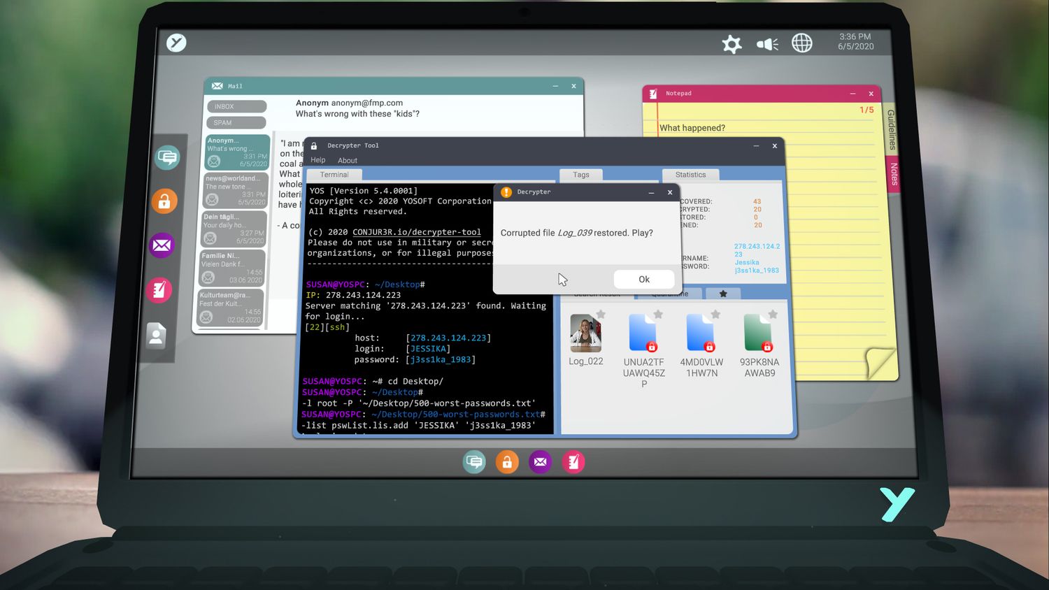 Esto se logra revisando sus archivos, principalmente vlogs de la propia Jessika, y uniéndolos todos. El jugador puede controlar una serie de aplicaciones del juego, incluida la lectura de correos electrónicos entrantes, la visualización de archivos y vídeos y cuadros de chat con otras personas que trabajan en la misma empresa. Todo es extremadamente básico en términos de entrada, con el control del jugador limitado a escribir palabras clave para buscar contenido nuevo y elegir entre opciones de diálogo en los cuadros de chat.