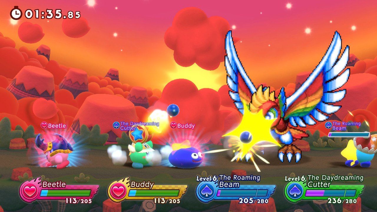Es una configuración simple, pero que funciona bien, especialmente como base para un juego de lucha más complicado. Las diversas habilidades de copia de Kirby tienen conjuntos de movimientos limitados, pero hay cierta profundidad para unir diferentes ataques y cronometrar ataques con compañeros de equipo en partidas 2 contra 2. También hay elementos para curar y causar caos, aunque en última instancia no hay suficientes para que las cosas sigan funcionando sin cesar. Si bien algunos juegos de lucha pueden mantener la fiesta toda la noche, Kirby luchadores 2 podría funcionar mejor como parte de una combinación de diferentes opciones multijugador.
