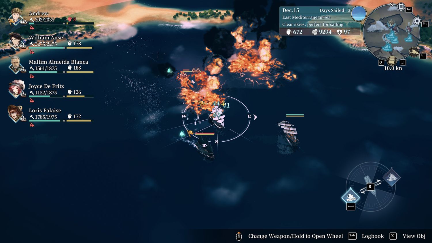Hay otras tripulaciones en el mar y no todas son amigables. Combatir en Era de la navegación Es bastante raro, pero pueden estallar batallas entre barcos por sorpresa. Durante estas escaramuzas, los cañones de proa y popa del barco dispararán automáticamente, pero es necesario apuntar el barco girándolo para que el indicador de orientación en forma de cono en el costado apunte al barco enemigo. Además, se puede abordar un barco enemigo para una ronda de combate cuerpo a cuerpo.