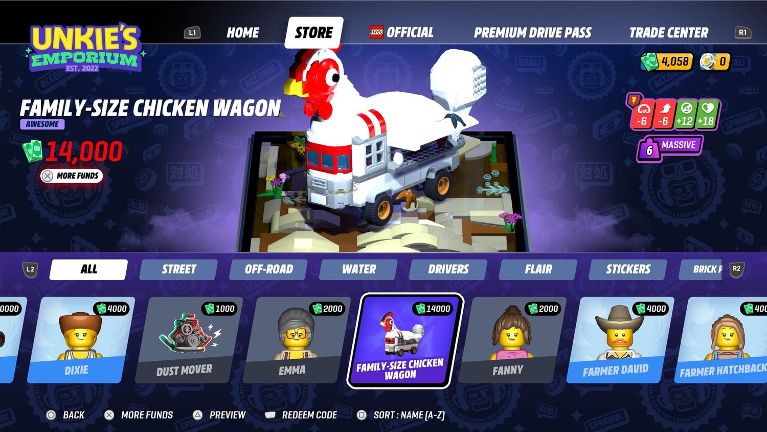 Microtransacciones en Unidad LEGO 2K brinde a los jugadores una gran cantidad de opciones para artículos cosméticos, como nuevos vehículos, conductores y opciones de personalización para sus vehículos en la tienda del juego: Unkie’s Emporium. La tienda usa una moneda llamada Brickbux, que se puede ganar jugando o comprar con dinero real. Unkie’s Emporium tiene muchos más artículos disponibles de los que la mayoría de los jugadores podrán ganar a través del juego; sin embargo, ganar lo suficiente para unos pocos vehículos favoritos y uno o dos conductores no toma mucho tiempo en acumularse.