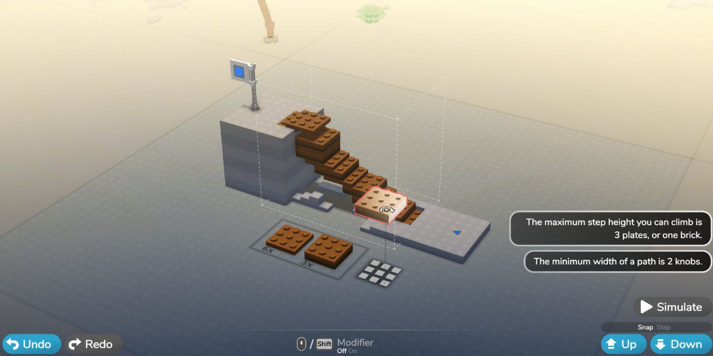Es necesario acostumbrarse a los controles mientras se usa el constructor de ladrillos y la cámara puede ser complicada para configurarla exactamente donde el jugador la desee. Hay múltiples elevaciones que se pueden usar y, aparte del área del tutorial, las instrucciones son ligeras, lo que permite a los jugadores usar realmente su imaginación para resolver cada área. La cantidad de ladrillos proporcionada siempre es suficiente y muchas veces quedará algo sobrante después de resolver con éxito un rompecabezas.