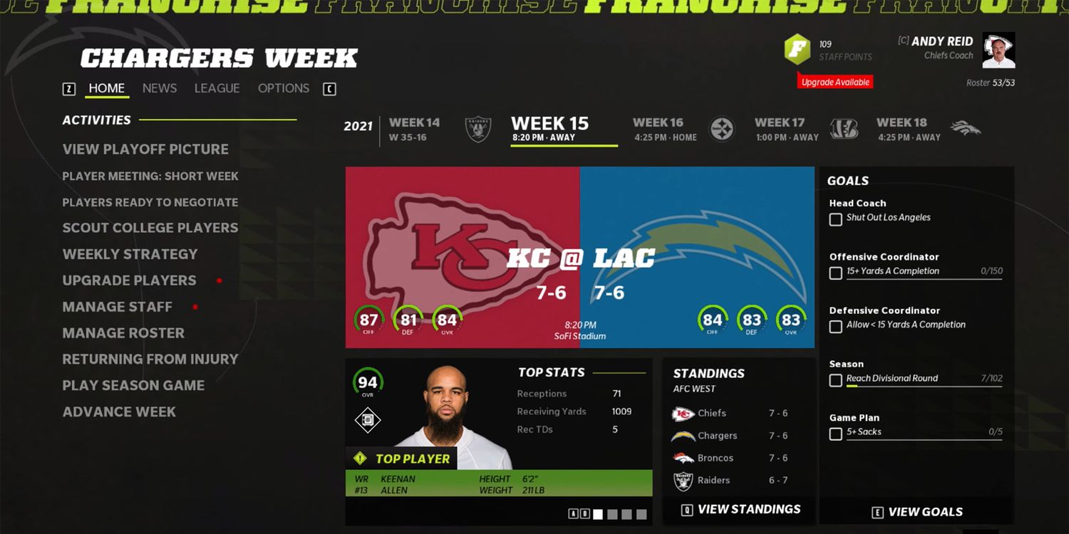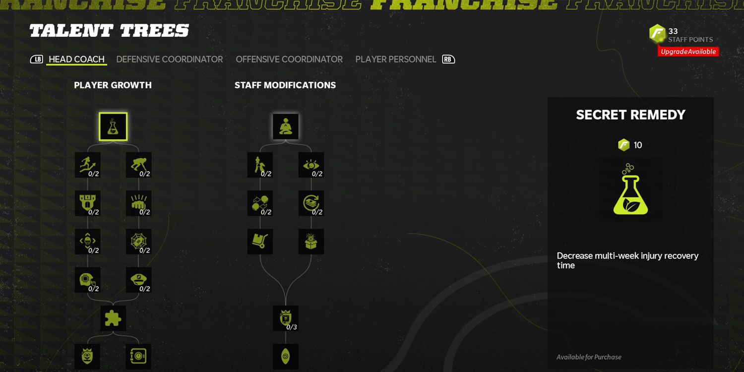 Afortunadamente, las otras mejoras ayudan drásticamente a la experiencia de la franquicia en su conjunto. El nuevo sistema de entrenamiento, que cuenta con un entrenador en jefe y coordinadores ofensivos y defensivos, es más intuitivo. La capacidad de realizar cambios de entrenador a lo largo de la temporada es una gran mejora; Si un fanático de los Giants está enojado con Joe Judge, puede cargar el modo Franquicia y despedirlo el primer día o a mitad de temporada. Los nuevos árboles de habilidades de entrenamiento y la planificación del día del juego también son mejoras notables, con personalización de la experiencia de entrenamiento disponible para adaptarse a un estilo de juego específico: una mejora. Enloquecer ha necesitado durante mucho tiempo, y uno que combina muy bien con el sistema de objetivos y estrategia semanal.